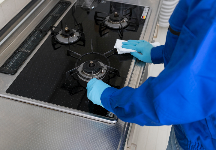 加熱調理器やシンク、吊り戸棚の表面、床、壁など、お手入れが必要な場所をご要望に応じてクリーニング。キッチン特有のこげつきやヌメリ、油汚れを材質に合わせた専用の洗剤や機材を使ってキレイに洗浄します。
